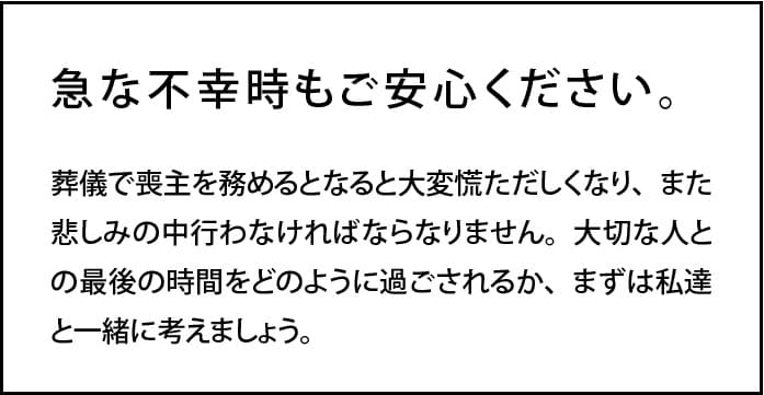 どなたでも突然の別れには戸惑うものです。経験豊富なスタッフが親切・丁寧に全力でサポートいたします。